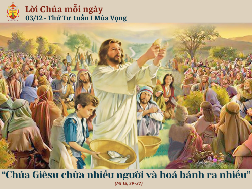 Người truyền dân chúng ngồi xuống đất. Người cầm lấy bảy chiếc bánh và mấy con cá, tạ ơn, bẻ