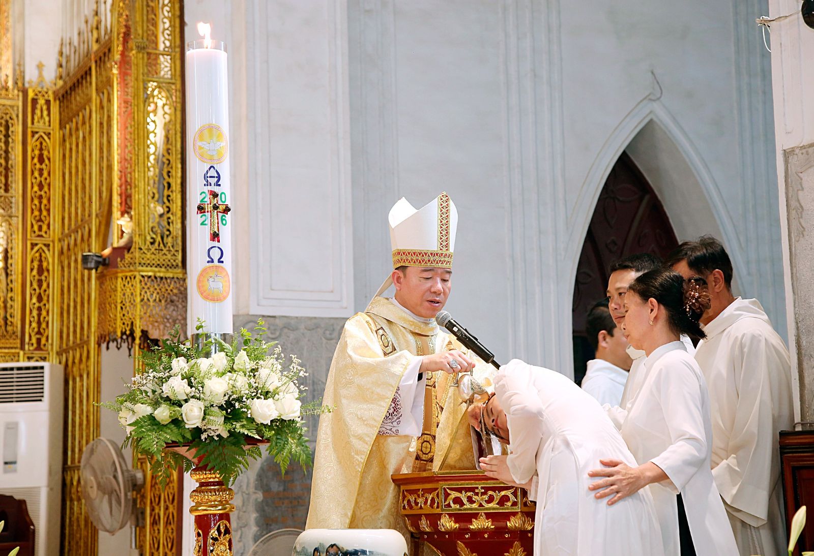 Khoảnh khắc thiêng liêng trong đêm Canh Thức Vượt Qua, vào lúc 20h00, tối thứ Bảy, ngày 04/4/2026, Đức Giám mục (ĐGM) Phụ tá Giuse Vũ Công Viện long trọng chủ sự Thánh lễ vọng Phục Sinh tại Tiểu Vương Cung Thánh Đường Sở Kiện. Trong đêm canh thức, Giáo xứ Sở Kiện vui mừng đón nhận thêm 2 chị em Tân tòng vào gia đình Giáo Hội.
