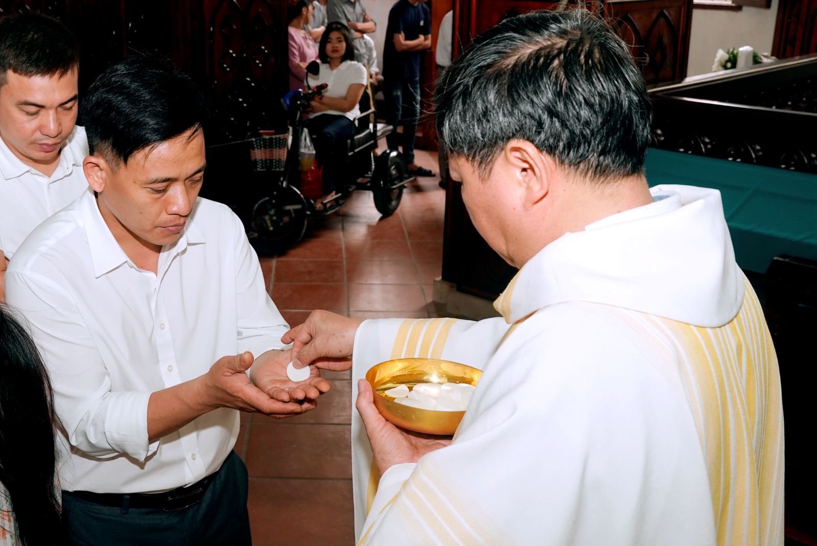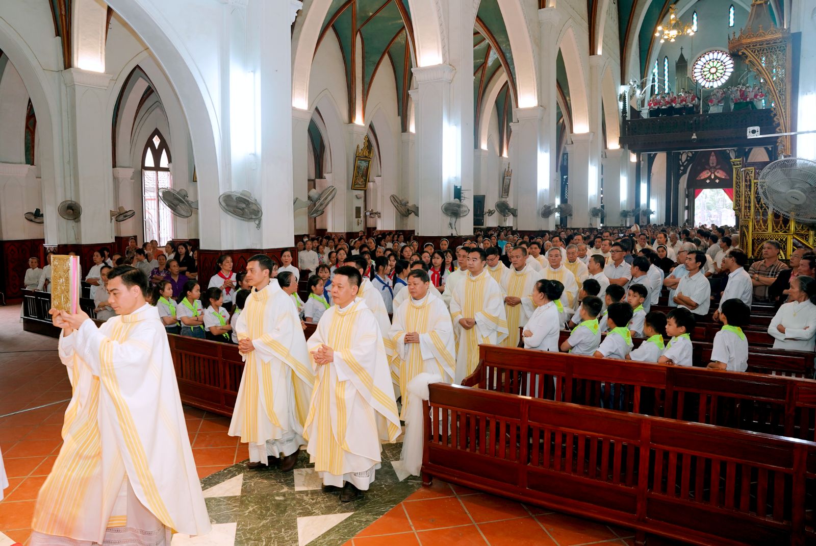 Đúng 10h30, ĐGM Phụ tá Giu-se Vũ Công Viện long trọng chủ sự Thánh lễ trong ngày chầu hồng phúc của Giáo xứ. Hiệp thông với ngài trong Thánh lễ có sự hiện diện của Cha An-tôn Trần Quang Tiến – Quản hạt Phủ Lý, Cha xứ Giu-se Phạm Đức Văn, Cha phó Giu-se Nguyễn Đức Tùng, quý cha tiền nhiệm, quý cha đồng tế, cùng sự hiệp thông của quý sơ và đông đảo cộng đoàn dân Chúa.