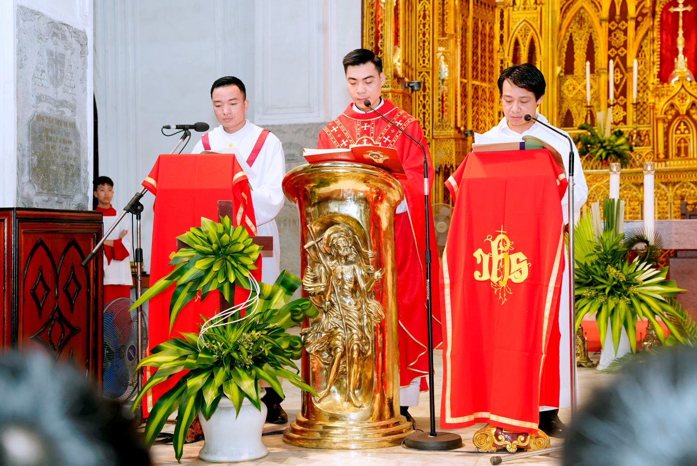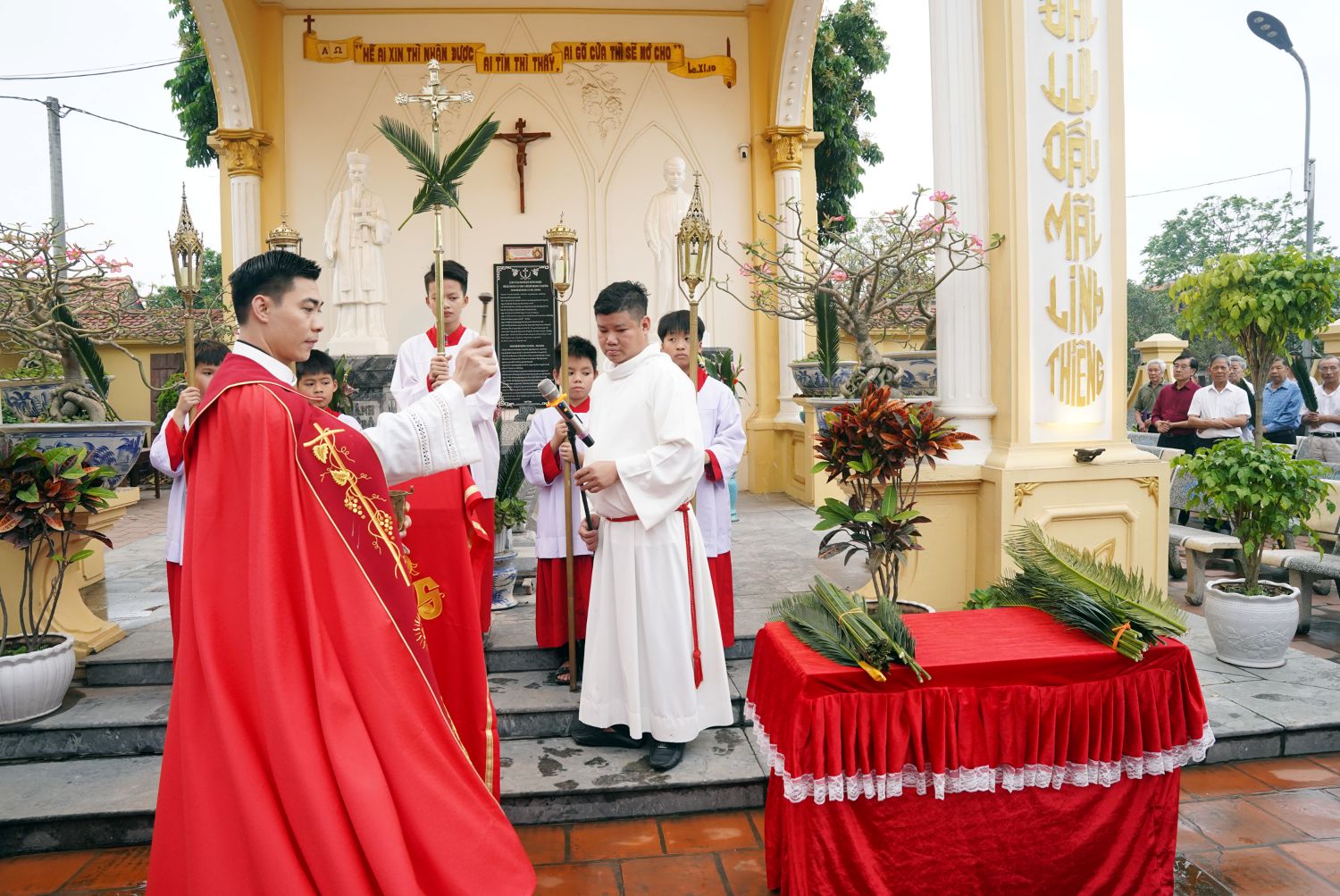 Hiệp thông với toàn thể Giáo Hội, vào lúc 15h30, thứ Bảy, ngày 28/3/2026, Cha phó Giuse Nguyễn Đức Tùng đã chủ sự nghi thức làm phép lá tại Đền Hai Thánh Tử Đạo quê hương. Kế đó, cộng đoàn rước lá tiến bước vào Tiểu Vương Cung Thánh Đường, hân hoan hòa vang khúc ca ngợi khen Chúa.