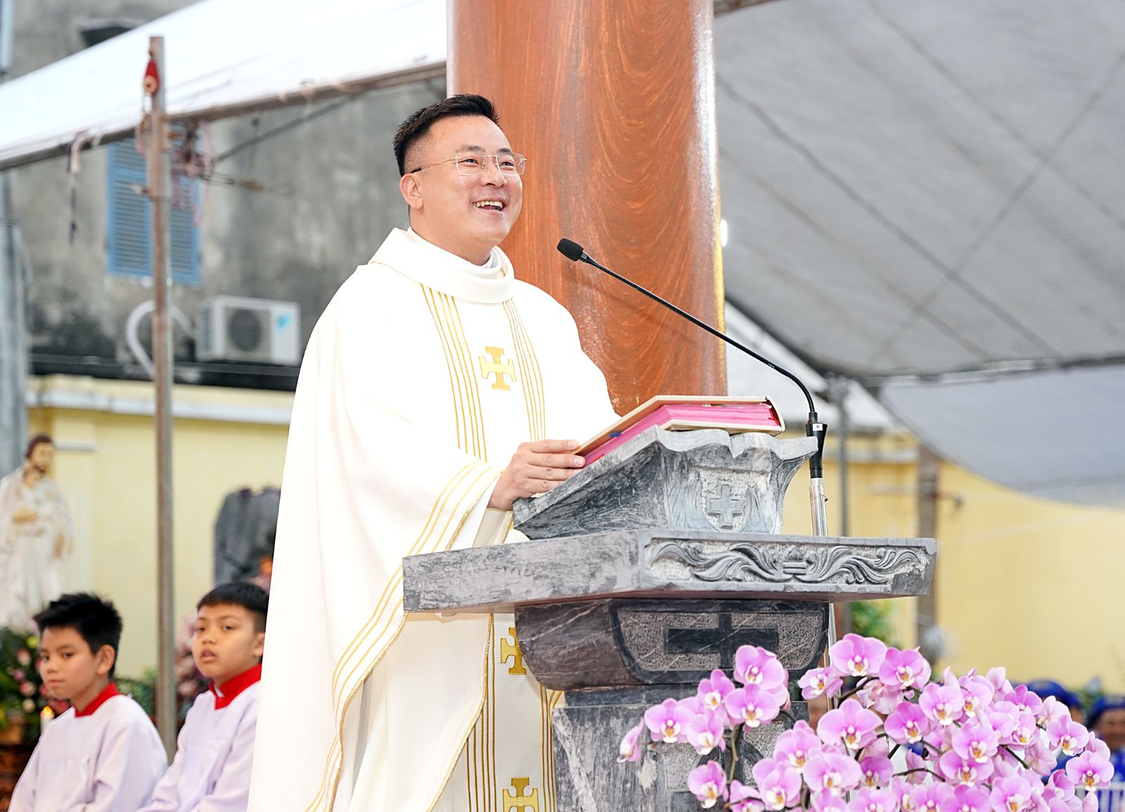 Mở đầu Thánh lễ, Cha chủ tế Giuse gửi lời chúc mừng quý cha và quý cộng đoàn trong ngày mừng lễ quan thầy. Bày tỏ niềm vui sau 8 năm trở lại dâng Thánh lễ tại nơi Đền Thánh, Cha Giuse cũng gợi nhắc về niềm tin sâu sắc mà Thiên Chúa, nhờ lời cầu bầu của Thánh Cả và ngang qua Giáo Hội, đã ghi dấu trên mảnh đất nơi đây.