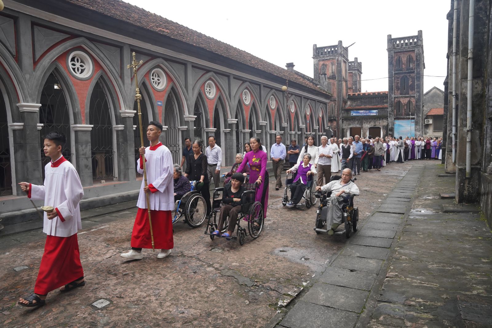 Sau khi kính viếng Hai Thánh Tử Đạo Quê hương, quý cụ và quý bệnh nhân cùng tiến bước vào Nhà Chúa, giữa tiếng hát ngân vang “Nhịp nhàng vui bước đi lên Đền Thánh Ngài. Dâng câu ca ngợi tình thương Chúa chan hoà…”