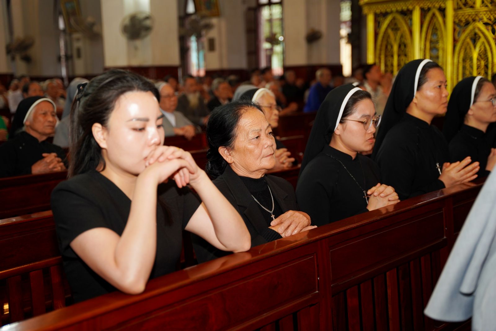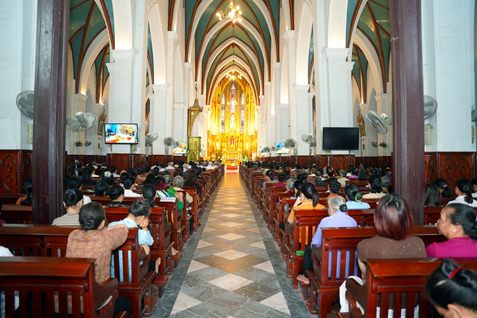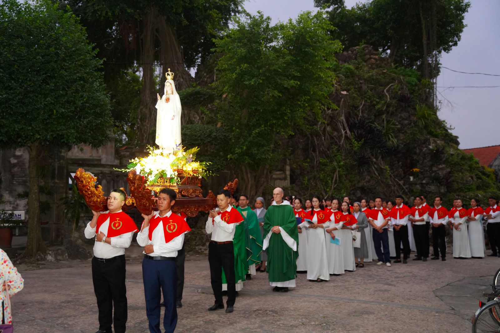 Kết thúc Thánh lễ, quý cha và cộng đoàn long trọng rước kiệu Đức Mẹ và lần chuỗi Mân côi xung quanh Nhà thờ.