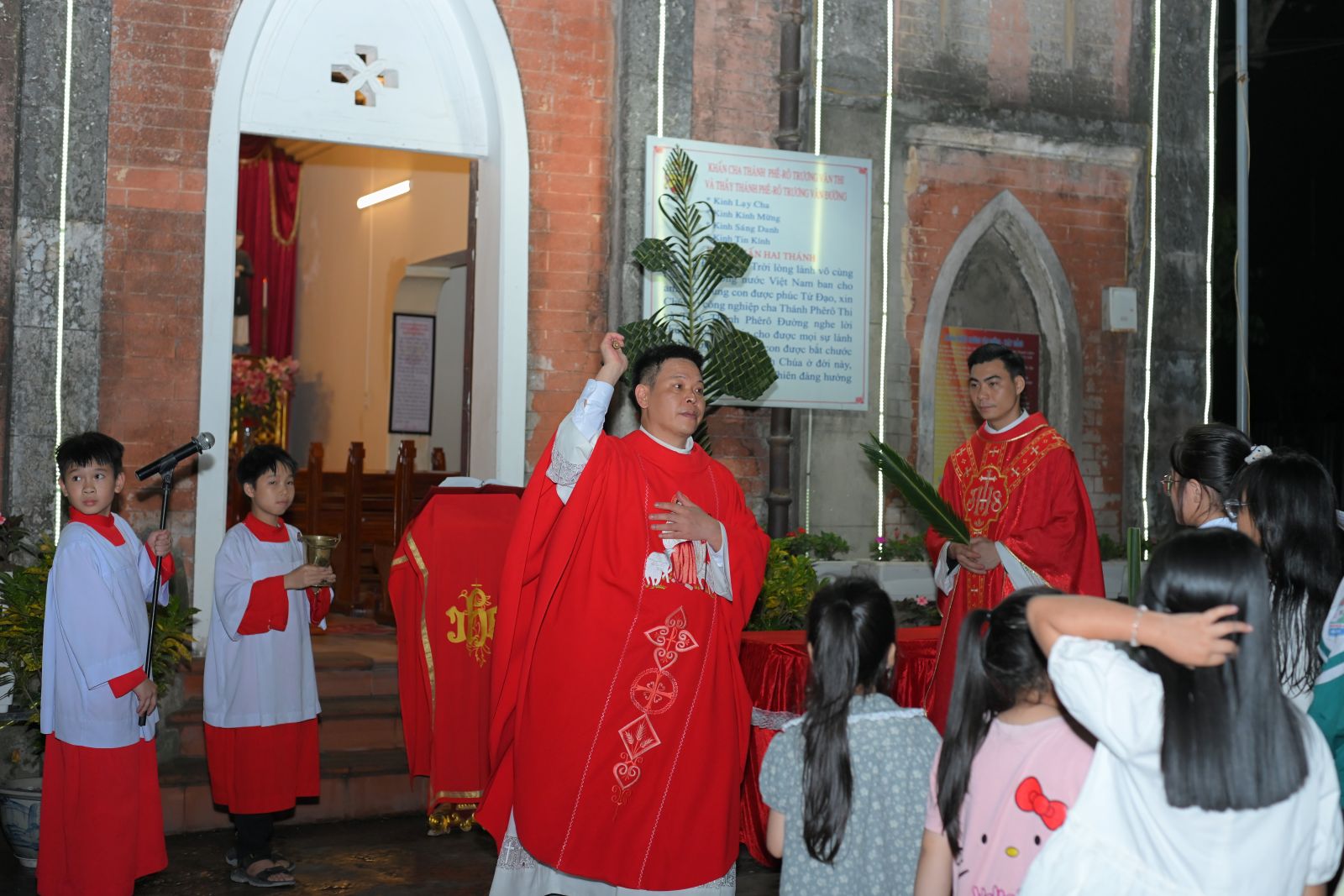 Trước giờ lễ là nghi thức làm phép lá trước Phòng xin khấn Hai Thánh Tử Đạo quê hương và cộng đoàn trang trọng rước lá vào Nhà thờ tham dự Thánh lễ.