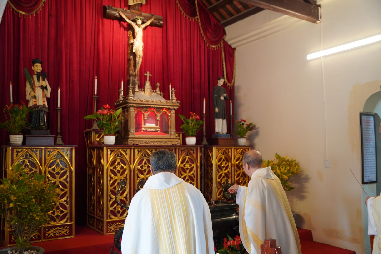 Vào lúc 10h45, cộng đoàn cùng hiện diện trước Nhà xin khấn hai Thánh Tử Đạo quê hương Sở Kiện để dâng lời kinh nguyện kính viếng các ngài.
