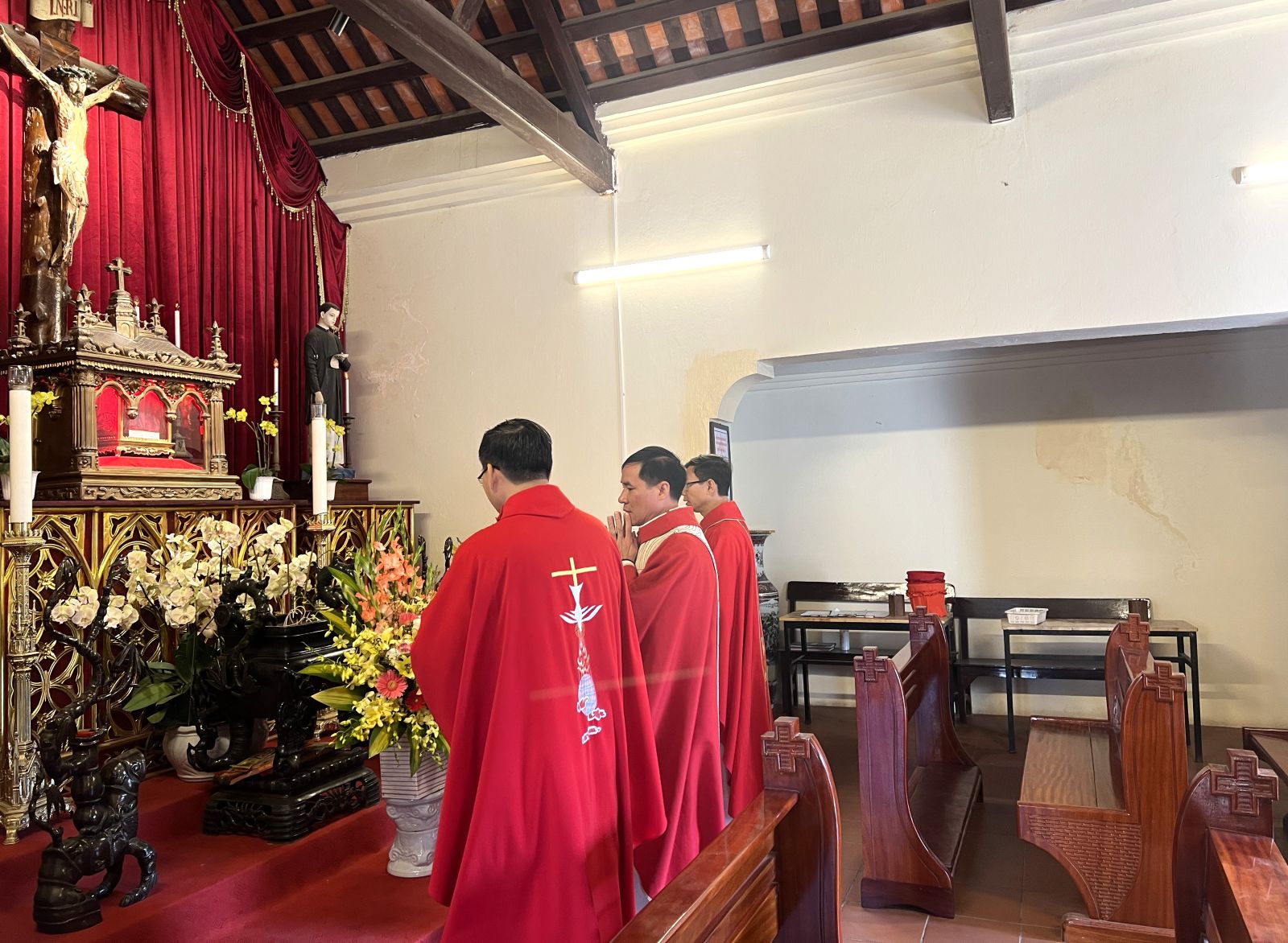 Trước Thánh lễ, quý cha, quý tu sĩ cùng cộng đoàn tiến về Nhà xin khấn Hai Thánh Tử Đạo quê hương Sở Kiện để dâng hương và kính viếng các ngài.