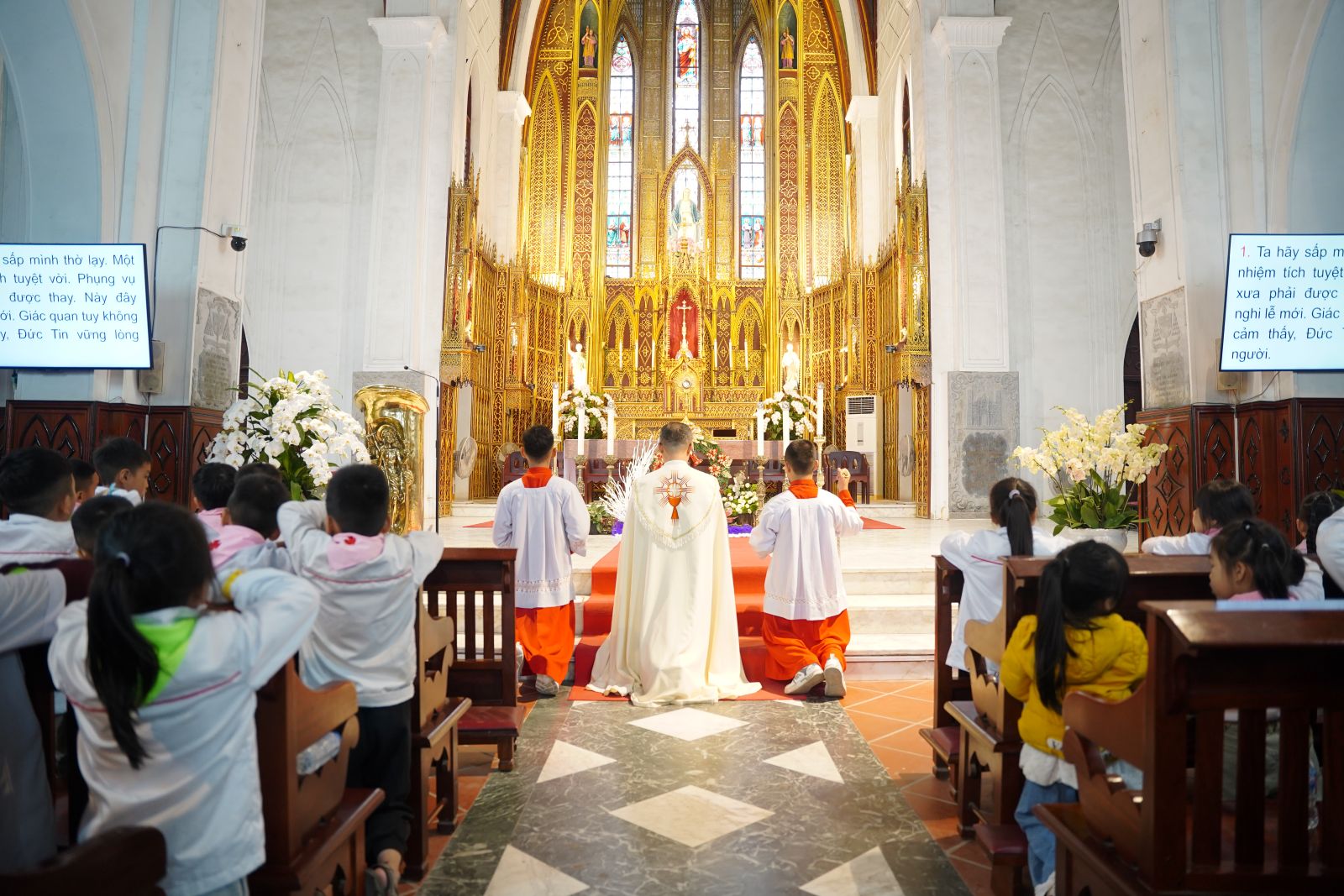 Cao điểm của ngày hành hương là Thánh lễ do Cha Giuse long trọng cử hành vào lúc 10h30. Các em tham dự Thánh lễ sốt sắng, từng lời nguyện chân thành và tiếng ca đơn sơ của các em là lễ vật đẹp nhất dâng về Thiên Chúa và Đức Mẹ.