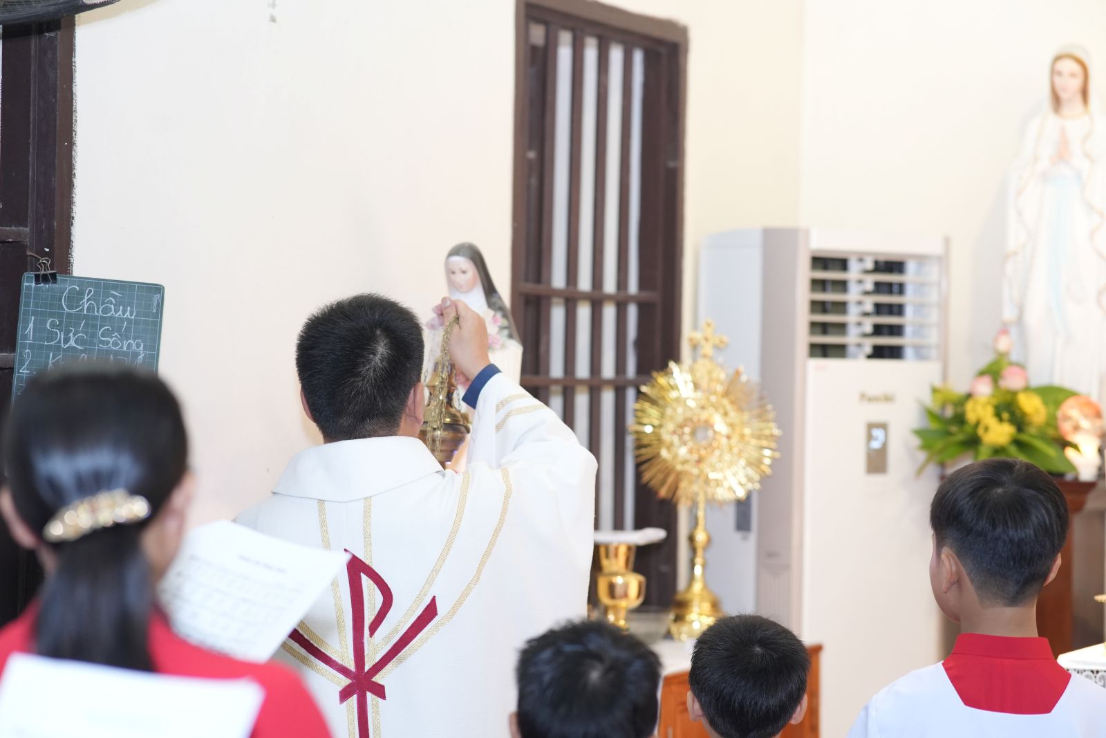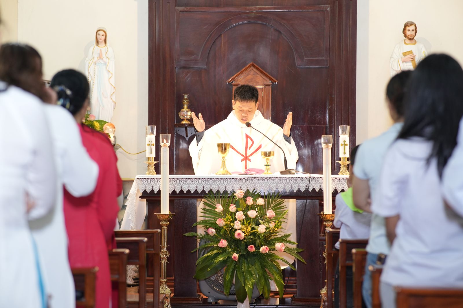 Thánh lễ do Cha xứ Giuse Phạm Đức Văn long trọng chủ sự vào lúc 18h30. Trong bầu khí linh thiêng, quý tu sĩ nam nữ cùng cộng đoàn đã dâng lời tạ ơn Thiên Chúa và tôn vinh Thánh Têrêsa Hài Đồng Giêsu.