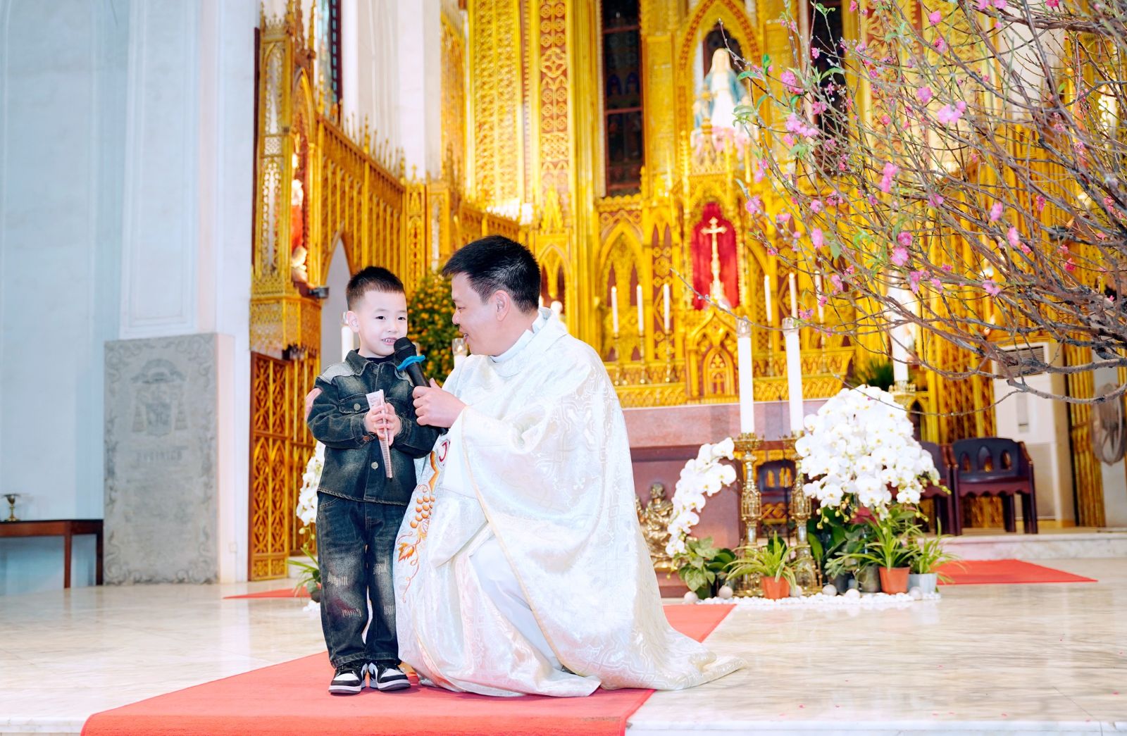 Sau khi công bố Tin Mừng, Cha Giuse chia sẻ với các em nhỏ trong bầu khí vui tươi. Cha dành món quà đặc biệt cho các gia đình, là tiểu sử của Cha Thánh Thi và Thầy Thánh Đường, để thôi thúc các gia đình cùng hướng dẫn con cái theo gương của Hai Thánh quê hương.