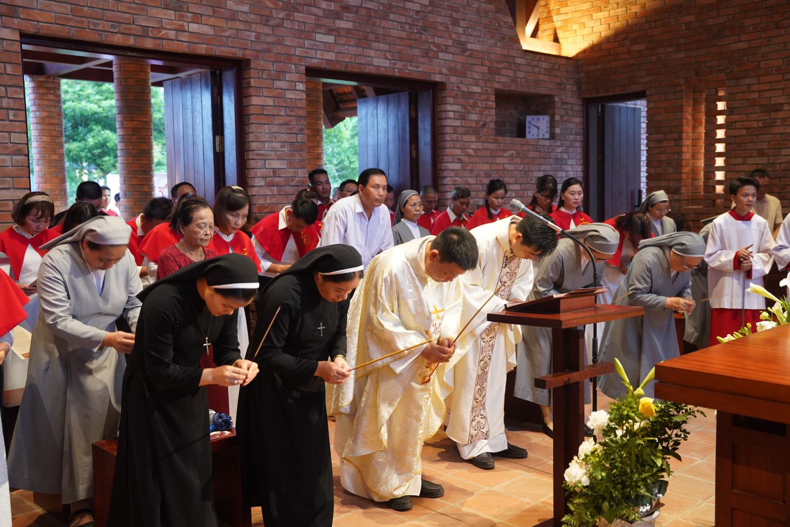 Trước Thánh lễ, quý cha cùng toàn thể cộng đoàn quy tụ tại Đền Thánh Phêrô Hiếu để dâng hương và kính viếng vị tiền nhân anh dũng đã hy sinh mạng sống mình để bảo vệ Tin Mừng của Chúa.