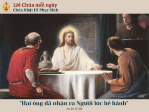 Cùng ngày thứ nhất trong tuần, có hai môn đệ đi đến một làng tên là Emmaus, cách Giêrusalem độ sáu mươi dặm. Dọc đường, các ông nói với nhau về những việc vừa xảy ra. Ðang khi họ nói truyện và trao đổi ý kiến với nhau, thì chính Chúa Giêsu tiến lại cùng đi với họ, nhưng mắt họ bị che phủ nên không nhận ra Người. Người hỏi: “Các ông có truyện gì vừa đi vừa trao đổi với nhau mà buồn bã vậy?” Một người tên là Clêophas trả lời: “Có lẽ ông là khách hành hương duy nhất ở Giêrusalem mà không hay biết những sự việc vừa xảy ra trong thành mấy ngày nay”. Chúa hỏi: “Việc gì thế?” Các ông thưa: “Sự việc liên can đến ông Giêsu quê thành Nadarét. Người là một vị tiên tri có quyền lực trong hành động và ngôn ngữ, trước mặt Thiên Chúa và toàn thể dân chúng. Thế mà các trưởng tế và thủ lãnh của chúng ta đã bắt nộp Người để xử tử và đóng đinh Người vào thập giá. Phần chúng tôi, chúng tôi vẫn hy vọng Người sẽ cứu Israel. Các việc ấy đã xảy ra nay đã đến ngày thứ ba rồi. Nhưng mấy phụ nữ trong nhóm chúng tôi, quả thật, đã làm chúng tôi lo sợ. Họ đến mồ từ tảng sáng. Và không thấy xác Người, họ trở về nói đã thấy thiên thần hiện ra bảo rằng: Người đang sống. Vài người trong chúng tôi cũng ra thăm mồ và thấy mọi sự đều đúng như lời các phụ nữ đã nói; còn Người thì họ không gặp”.