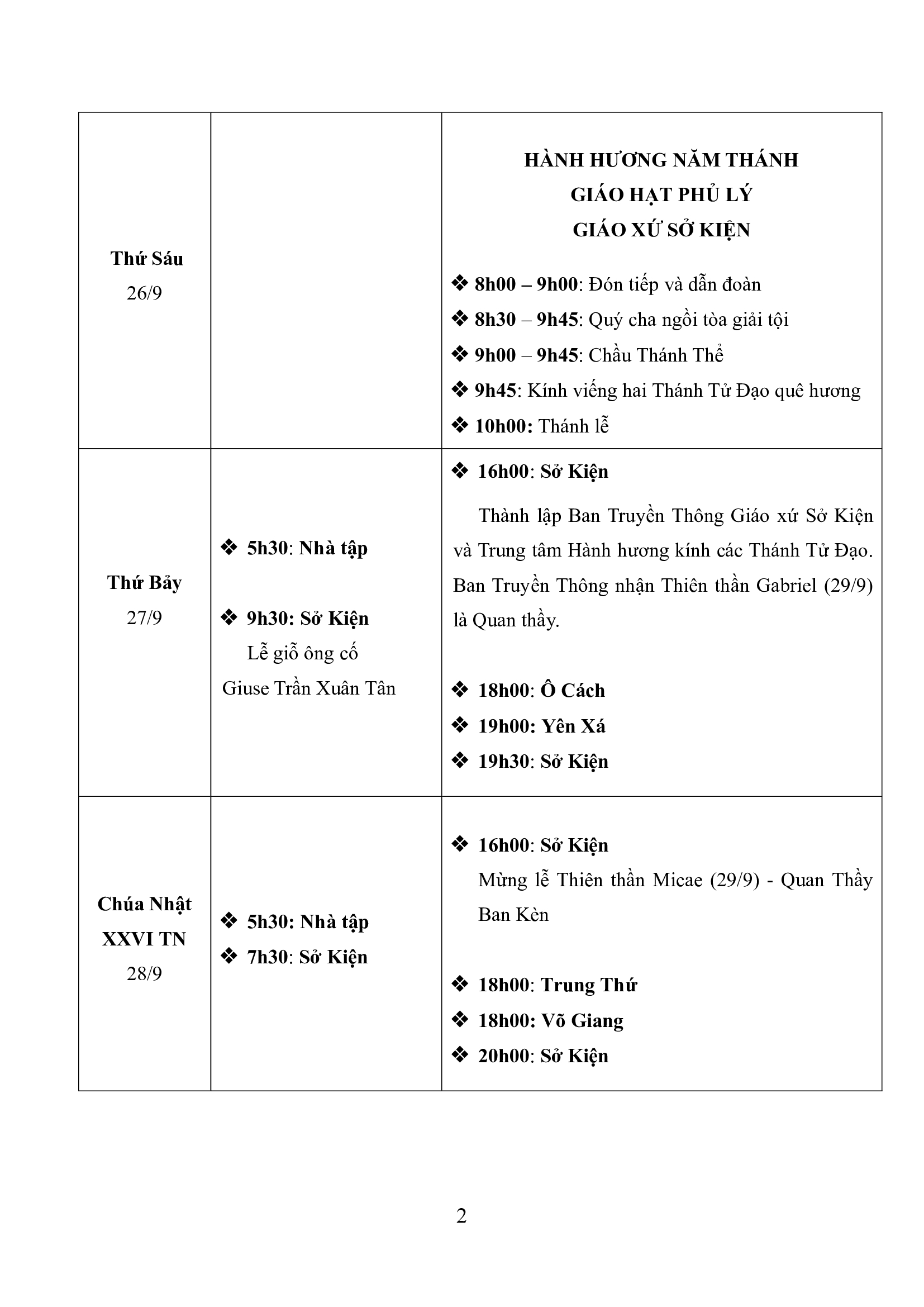 – Ngày 26/9: Chương trình Giáo hạt Phủ lý hành hương Năm Thánh – Giáo xứ Sở Kiện