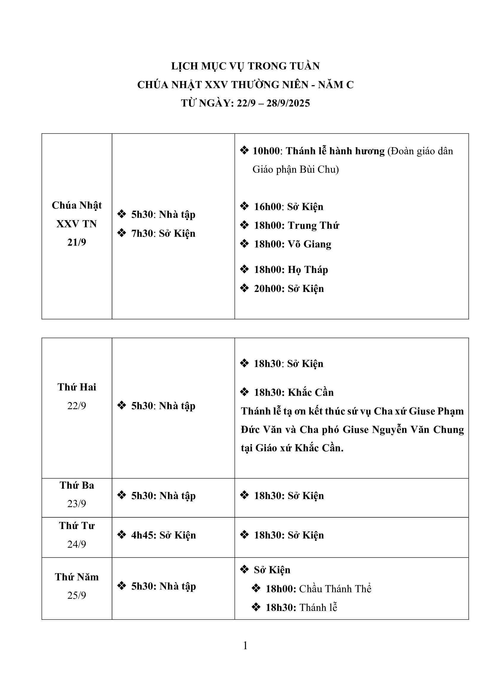 – 18h30 ngày 22/9: Thánh lễ tạ ơn kết thúc sứ vụ Cha xứ Giuse Phạm Đức Văn và Cha phó Giuse Nguyễn Văn Chung tại Giáo xứ Khắc Cần.