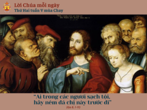 Khi ấy, Chúa Giêsu lên núi cây dầu. Và từ sáng sớm, Người lại vào trong đền thờ. Toàn dân đến cùng Người, nên Người ngồi xuống và bắt đầu giảng dạy. Lúc đó, luật sĩ và biệt phái dẫn đến Người một thiếu phụ bị bắt quả tang phạm tội ngoại tình, và họ đặt nàng đứng trước mặt mọi người. Họ hỏi Chúa Giêsu: “Thưa Thầy, thiếu phụ này bị bắt quả tang phạm tội ngoại tình, mà theo luật Môsê, hạng phụ nữ này phải bị ném đá. Còn Thầy, Thầy dạy sao?” Họ nói thế có ý gài bẫy Người để có thể tố cáo Người. Nhưng Chúa Giêsu cúi xuống, bắt đầu lấy ngón tay viết trên đất. Vì họ cứ hỏi mãi, nên Người đứng lên và bảo họ: “Ai trong các ngươi sạch tội, hãy ném đá chị này trước đi”. Và Người ngồi xuống và lại viết trên đất. Nghe nói thế họ rút lui từng người một, bắt đầu là những người nhiều tuổi nhất, và còn lại một mình Chúa Giêsu với người thiếu phụ vẫn đứng đó. Bấy giờ Chúa Giêsu đứng thẳng dậy và bảo nàng: “Hỡi thiếu phụ, những người cáo chị đi đâu cả rồi? Không ai kết án chị ư?” Nàng đáp: “Thưa Thầy, không có ai”. Chúa Giêsu bảo: “Ta cũng thế, Ta không kết tội chị. Vậy chị hãy đi, và từ nay đừng phạm tội nữa”.