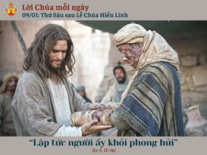 Xảy ra khi Chúa Giêsu đang ở trong một thành kia, thì có một người mình đầy phong hủi, thấy Chúa Giêsu, liền sấp mặt xuống đất, van xin Ngài rằng: “Lạy Thầy, nếu Thầy muốn, Thầy có thể cho tôi được sạch”. Người giơ tay chạm đến người ấy và nói: “Ta muốn, hãy nên trơn sạch”. Lập tức, người ấy khỏi phong hủi. Người ra lệnh cho người ấy không được nói với ai, nhưng: “Hãy đi trình diện với tư tế, và hãy dâng lễ vật như luật Môsê đã dạy, để làm chứng cho người ta biết ngươi được sạch”. Nhưng tiếng đồn về Người cứ lan rộng, và dân chúng đông đảo kéo nhau đến để nghe Người và được chữa lành bệnh tật. Còn Người, thì lánh vào nơi hoang vắng và cầu nguyện.