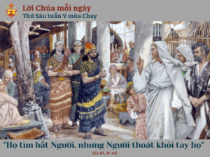 Khi ấy, người Do-thái lượm đá để ném Chúa Giêsu. Người lên tiếng hỏi rằng: “Ta đã cho các ngươi thấy nhiều việc tốt lành bởi Cha Ta. Vậy vì việc nào mà các ngươi muốn ném đá Ta?” Người Do-thái trả lời: “Chúng tôi muốn ném đá ông không phải vì việc lành, nhưng vì một lời lộng ngôn, bởi vì ông chỉ là người mà lại tự cho mình là Thiên Chúa”. Chúa Giêsu đáp lại: “Nào trong sách luật của các ngươi không có chép câu này: “Ta đã nói: các ngươi là thần”? Vậy nếu sách luật gọi những kẻ được nghe lời Chúa là thần, mà Kinh Thánh không thể huỷ diệt được, thì tại sao các ngươi nói với Ðấng đã được Chúa Cha thánh hoá và sai đến trong trần gian rằng “Ông nói lộng ngôn”, vì Ta đã nói Ta là Con Thiên Chúa? Nếu Ta không làm những việc của Cha Ta, thì các ngươi đừng tin Ta. Nhưng nếu Ta làm những việc đó, thì dầu các ngươi không muốn tin Ta, cũng hãy tin vào các việc đó, để các ngươi biết và tin rằng: Cha ở trong Ta, và Ta ở trong Cha”. Bởi đó họ tìm cách bắt Người, nhưng Người thoát khỏi tay họ. Người lại qua bên kia sông Giođan, nơi trước kia Gioan đã làm phép rửa. Và Người ở lại đó. Có nhiều kẻ đến cùng Người. Họ nói: “Gioan đã không làm một phép lạ nào. Nhưng mọi điều Gioan nói về người này đều đúng cả”. Và có nhiều kẻ tin Người.