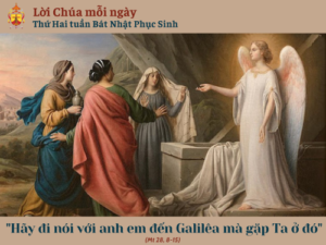 Khi ấy, các bà vội ra khỏi mồ vừa sợ lại vừa hớn hở vui mừng, chạy báo tin cho các môn đệ Chúa. Và này Chúa Giêsu đón gặp các bà, Người nói: “Chào các bà”. Các bà liền lại gần ôm chân Người và phục lạy. Bấy giờ Chúa Giêsu bảo: “Các bà đừng sợ. Hãy đi báo tin cho các anh em Ta phải trở về Galilêa, rồi ở đó họ sẽ gặp Ta”.