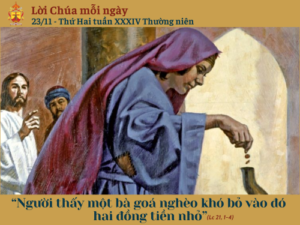 Khi ấy, Chúa Giêsu nhìn lên, thấy những người giàu có bỏ tiền dâng cúng vào hòm tiền. Người cũng thấy một bà goá nghèo khó bỏ vào đó hai đồng tiền nhỏ, nên bảo rằng: “Thầy bảo thật các con, bà goá nghèo khó này đã bỏ vào hòm tiền nhiều hơn mọi người. Vì mọi người kia lấy của dư thừa mà dâng cho Thiên Chúa, còn bà này túng thiếu, bà đã dâng tất cả những gì bà có để nuôi sống mình”.