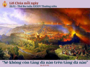 Khi ấy, có mấy người trầm trồ về đền thờ được trang hoàng bằng đá tốt và những lễ vật quý, nên Chúa Giêsu phán rằng: “Những gì các con nhìn ngắm đây, sau này sẽ đến ngày không còn hòn đá nào nằm trên hòn đá nào mà chẳng bị tàn phá”. Bấy giờ các ông hỏi Người rằng: “Thưa Thầy, bao giờ những sự ấy sẽ xảy ra, và cứ dấu nào mà biết những sự đó sắp xảy đến?” Người phán: “Các con hãy ý tứ kẻo bị người ta lừa dối: vì chưng, sẽ có nhiều kẻ mạo danh Thầy đến mà tự xưng rằng: “Chính ta đây và thời gian đã gần đến”, các con chớ đi theo chúng. Khi các con nghe nói có chiến tranh loạn lạc, các con đừng sợ: vì những sự ấy phải đến trước đã, nhưng chưa phải là hết đời ngay đâu”.