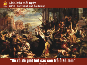 Giờ đây, nhìn lên các Thánh Anh Hài, những người đã chịu tử đạo vì Chúa, chúng ta được mời gọi sống tinh thần “tử đạo” trong cuộc sống hôm nay. Tuy nhiên, chúng ta cũng nghĩ đến vua Hê-rô-đê, là người gây ra cuộc bách hại đó. Nghĩ đến ông, chúng ta liên tưởng đến tội lỗi, tính xấu, sự nhỏ nhen, ích kỷ và kiêu căng của con người. Nếu trong con người chúng ta vẫn còn nhiều những điều này, thì dù Chúa đã giáng trần và ở ngay bên cạnh chúng ta, chúng ta vẫn rất khó có thể nhận ra và đón tiếp Người.
