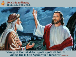 Khi ấy, Chúa Giêsu nói với Nicôđêmô rằng: “Thật, Tôi bảo cho ông biết: Ông đừng ngạc nhiên vì nghe Tôi nói rằng: Các ngươi phải tái sinh bởi trời. Gió muốn thổi đâu thì thổi, ông nghe tiếng gió, nhưng chẳng biết gió từ đâu đến và đi đâu: mọi kẻ sinh bởi Thần Linh cũng vậy”. Nicôđêmô hỏi lại rằng: “Việc ấy xảy ra thế nào được?” Chúa Giêsu đáp: “Ông là bậc thầy trong dân Israel mà ông không biết điều ấy sao? Thật, tôi bảo thật cho ông biết: Ðiều chúng tôi biết thì chúng tôi nói; điều chúng tôi thấy thì chúng tôi minh chứng. Nhưng các ông lại không nhận lời chứng của chúng tôi. Nếu khi Tôi nói về những sự dưới đất mà các ông không tin, khi Tôi nói những sự trên trời, các ông tin thế nào được? Không ai lên trời được, ngoài người đã từ trời xuống, tức là Con Người vốn ở trên trời. Cũng như Môsê treo con rắn nơi hoang địa thế nào, thì Con Người cũng phải bị treo lên như vậy, để những ai tin vào Người, thì không bị tiêu diệt muôn đời”.