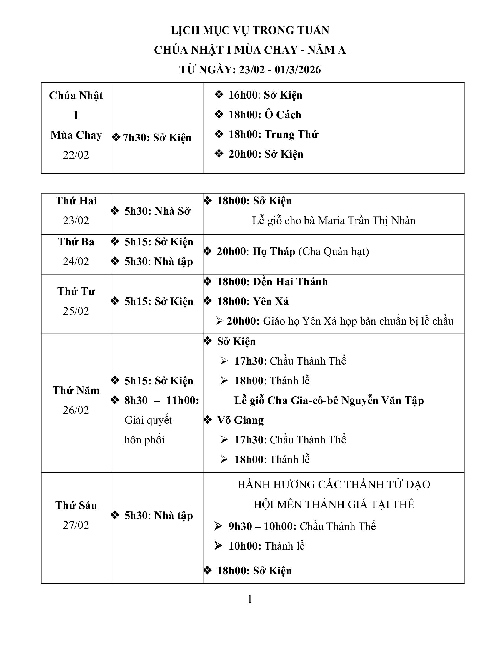 – 18h00 ngày 26/02: Lễ giỗ Cha Gia-cô-bê Nguyễn Văn Tập