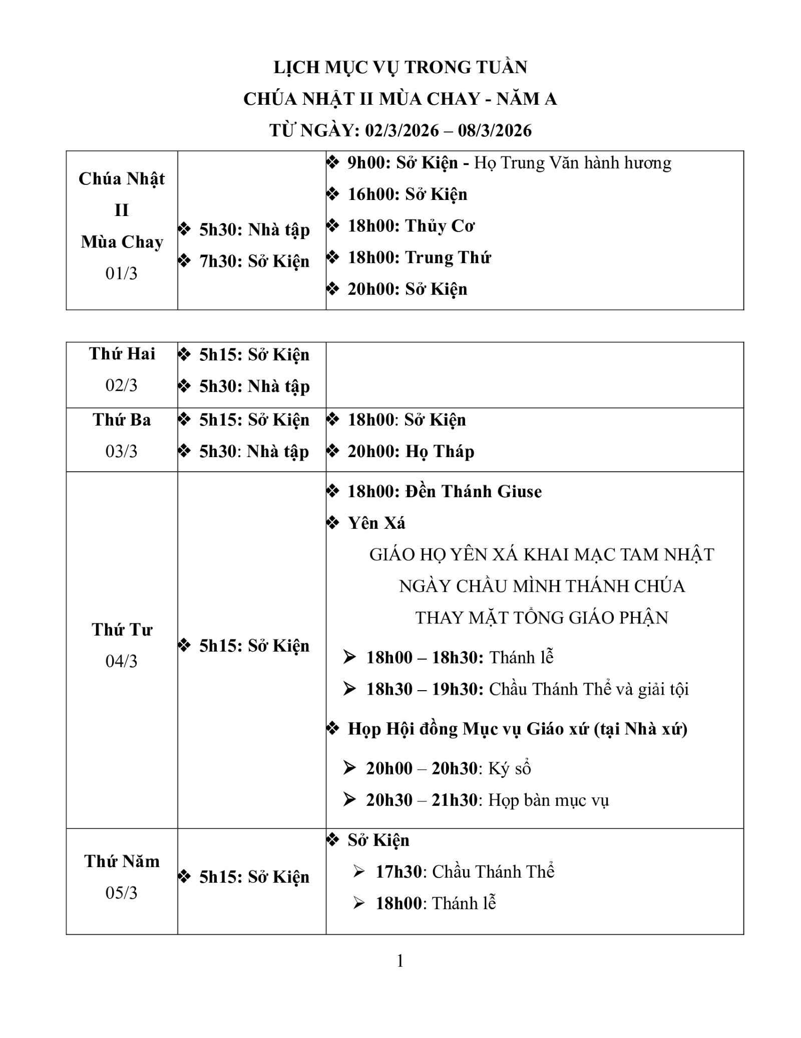 – Chúa Nhật ngày 08/3: Giáo họ Yên Xá Chầu Thánh Thể thay mặt Tổng Giáo phận