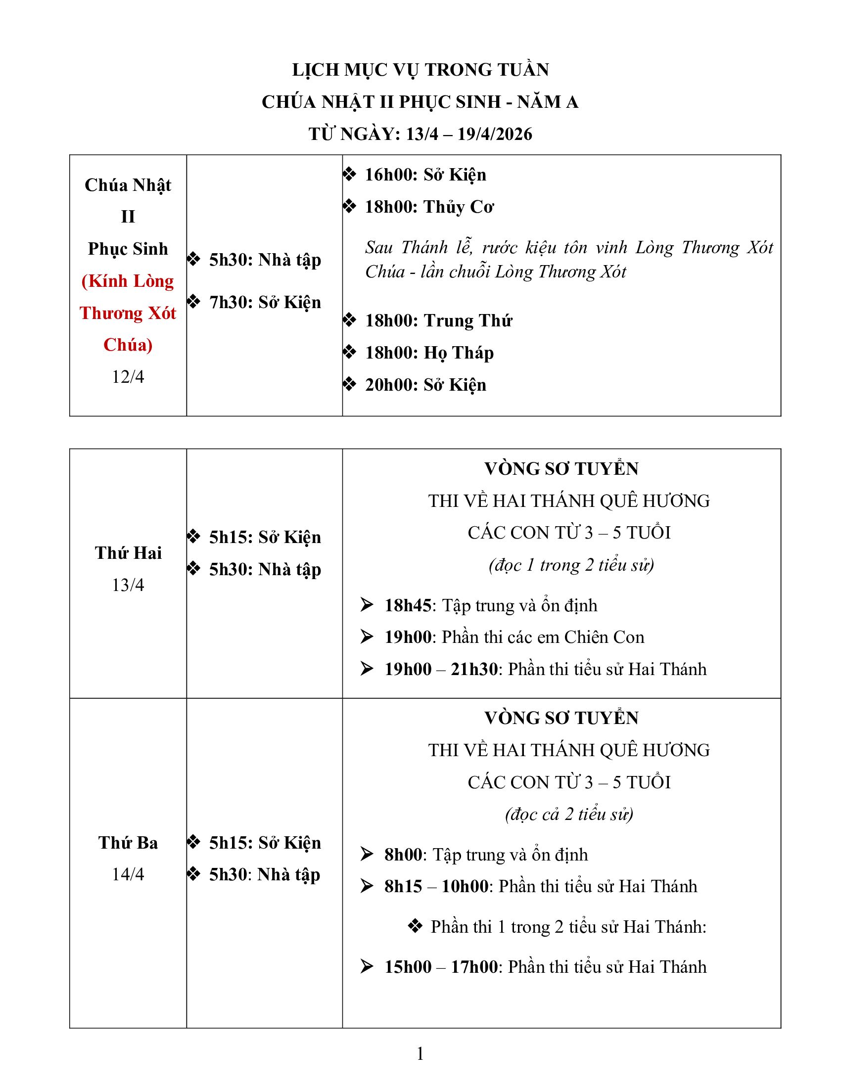 Lịch Mục vụ trong tuần Chúa Nhật II Phục Sinh từ ngày: 13/4 – 19/4/2026