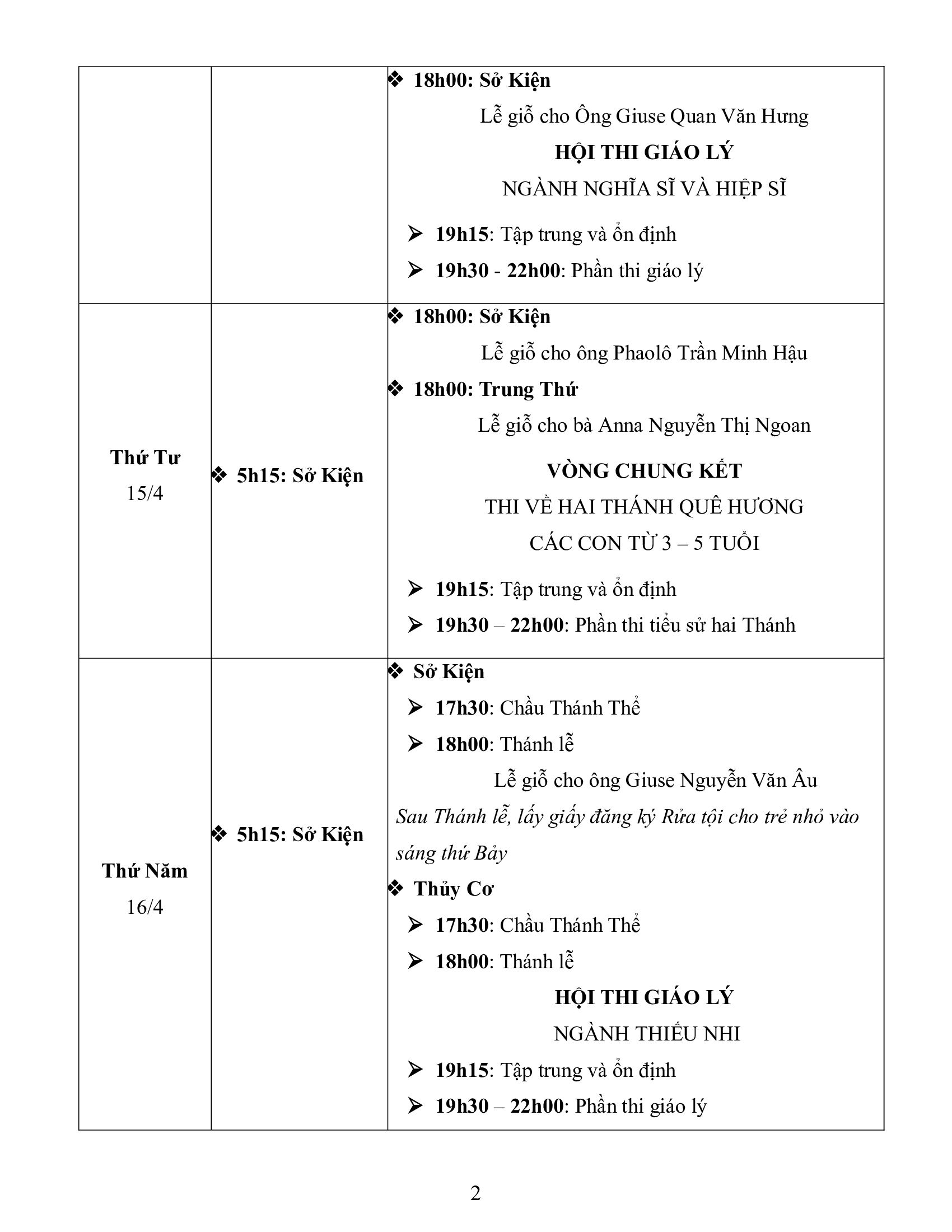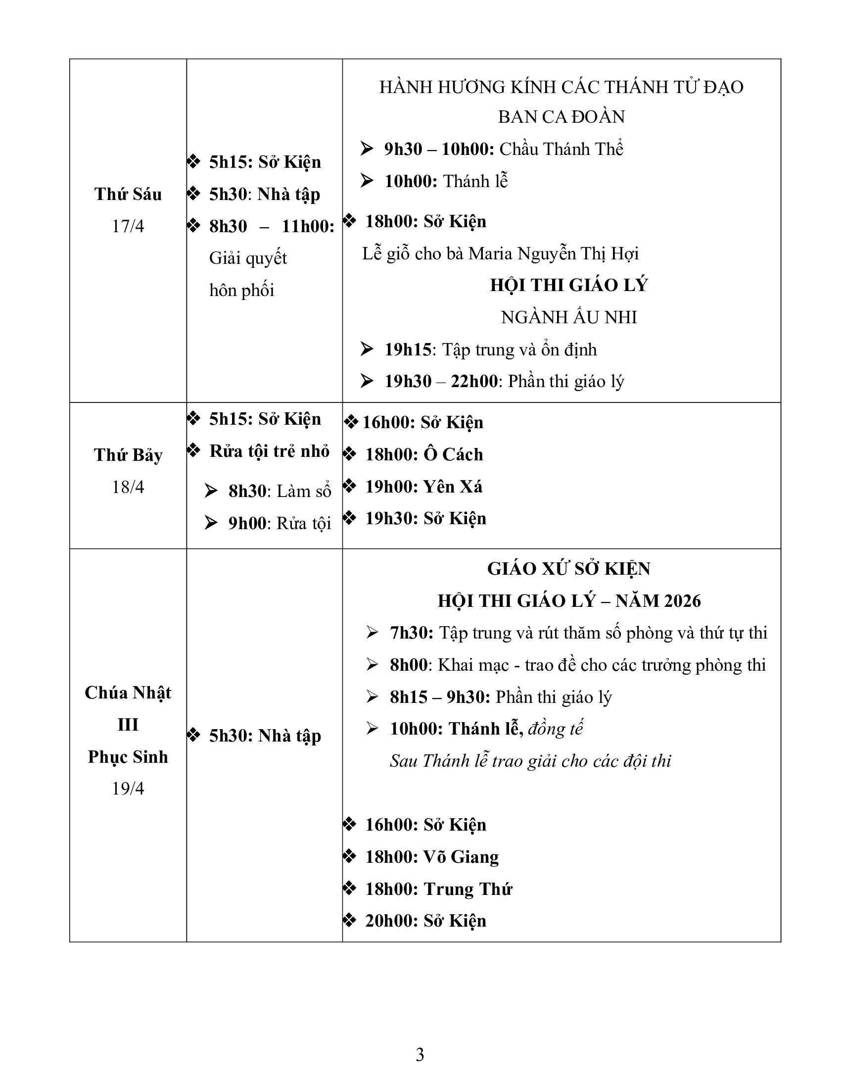 Lịch Mục vụ trong tuần Chúa Nhật II Phục Sinh từ ngày: 13/4 – 19/4/2026