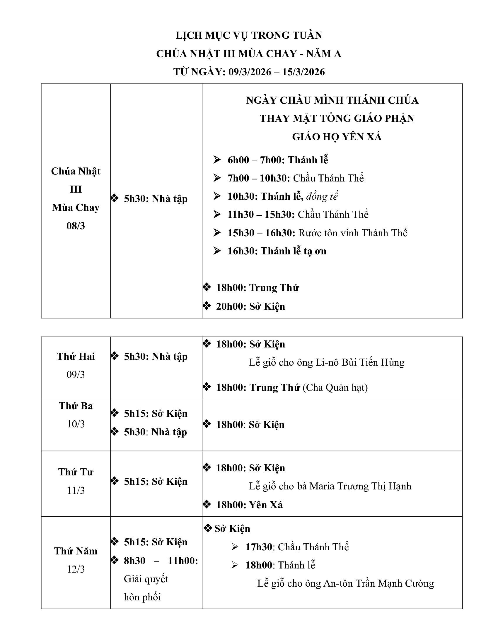 Lịch Mục vụ trong tuần Chúa Nhật III Mùa Chay từ ngày: 09/3 – 15/3/2026