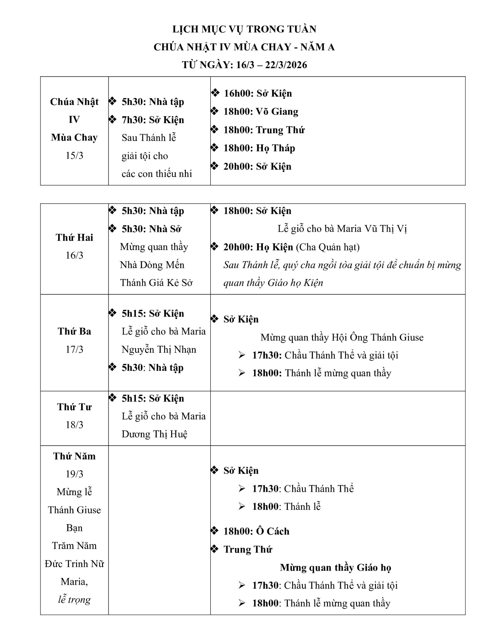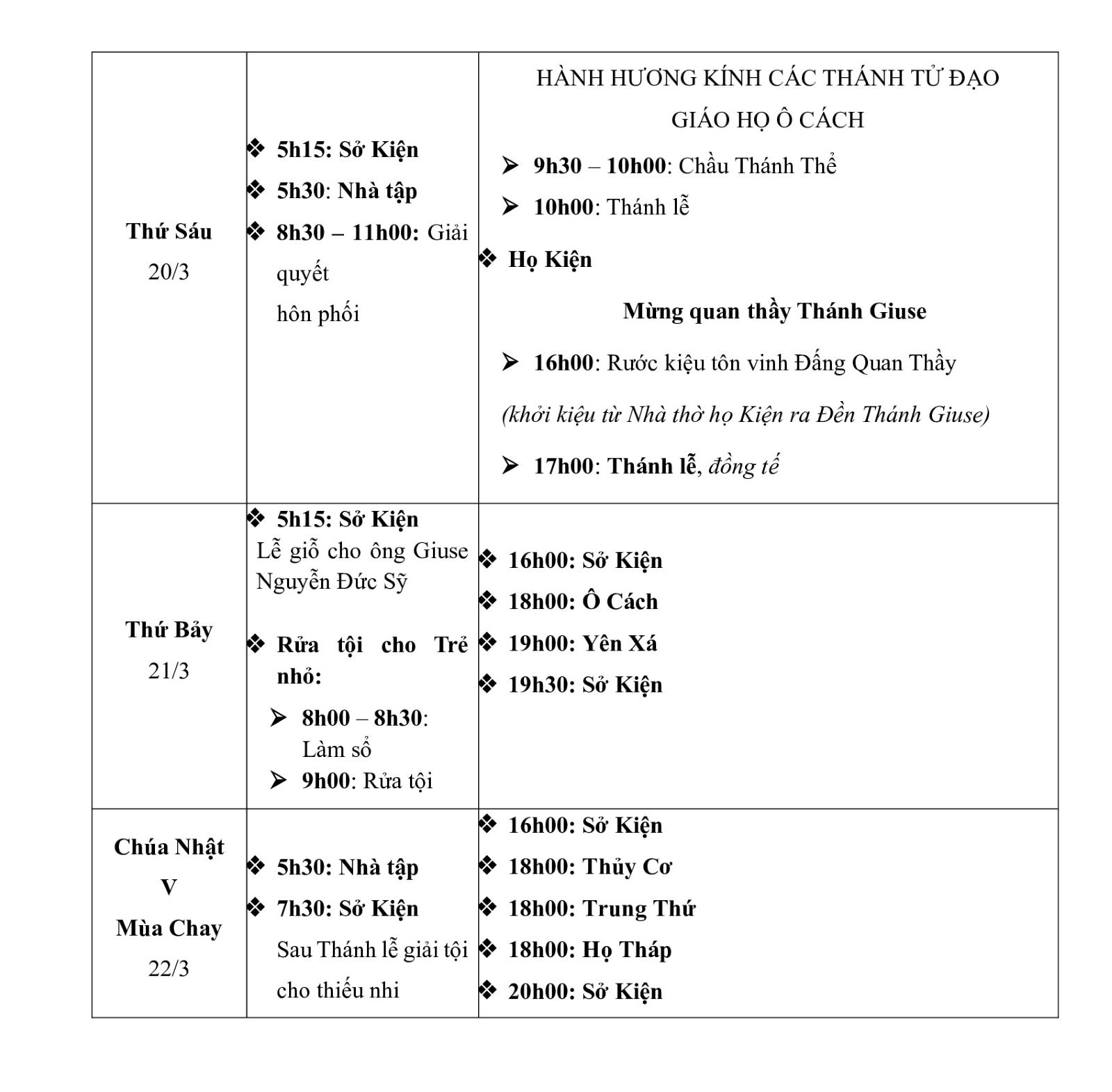 – Ngày 19/3: Quan thầy Giáo họ Trung Thứ