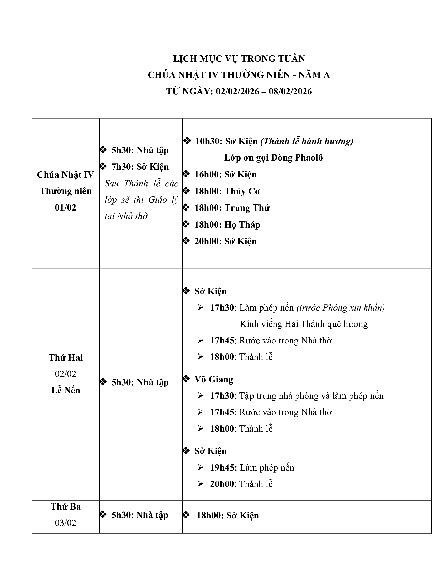 Lịch Mục vụ trong tuần Chúa Nhật IV Thường niên từ ngày: 02/02 – 08/02/2026