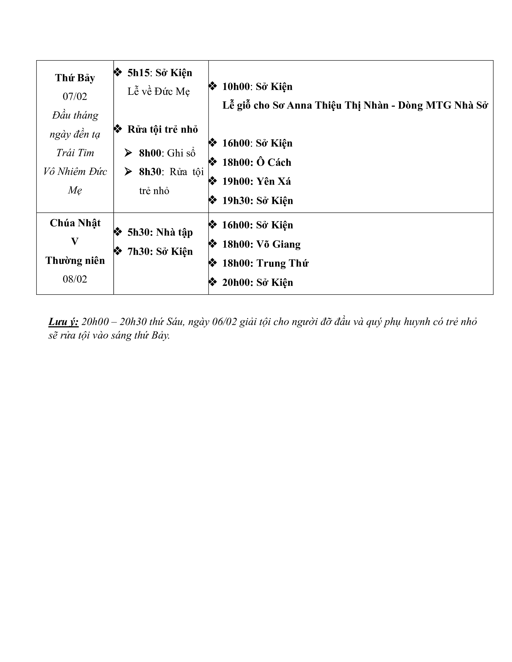 – Chiều ngày 06/02: Giáo xứ Sở Kiện chầu Thánh Thể thứ Sáu đầu tháng