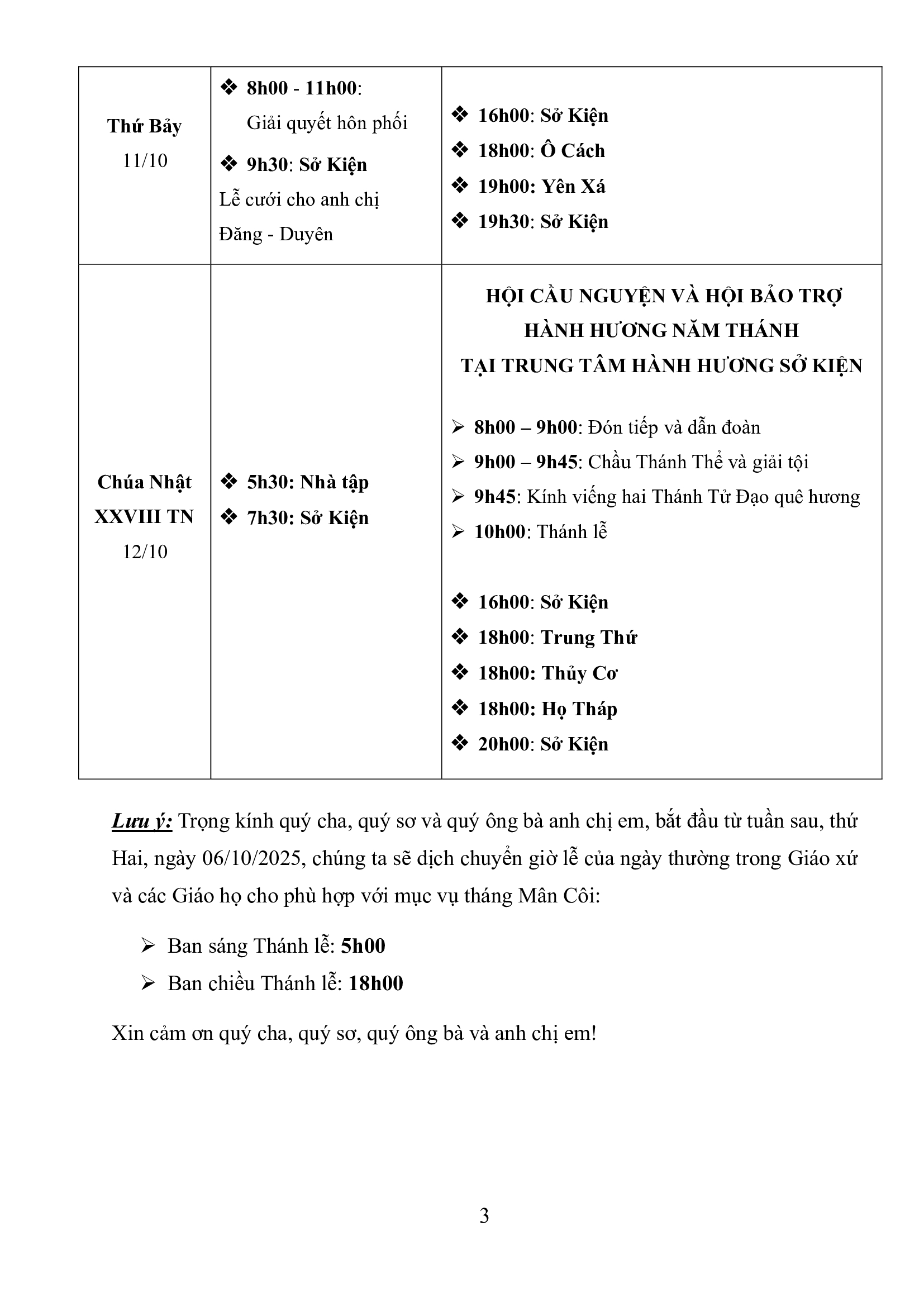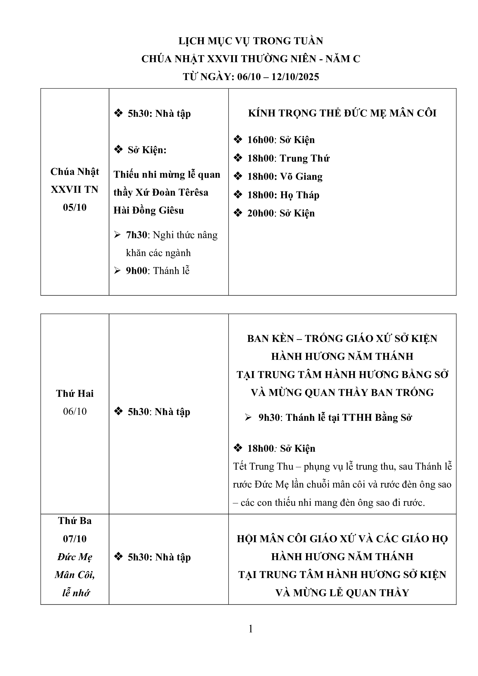 Lịch Mục vụ trong tuần Chúa Nhật XXVII Thường niên từ ngày: 06/9 – 12/10/2025