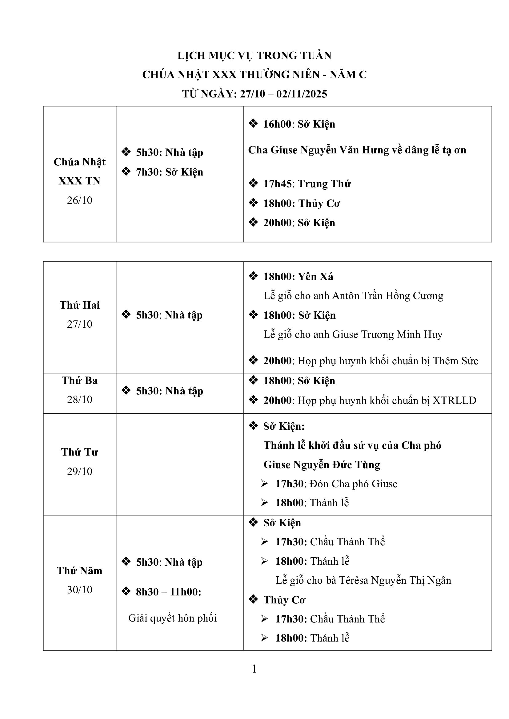 – 18h00 ngày 29/10: Thánh lễ khởi đầu sứ vụ của Cha phó Giuse Nguyễn Đức Tùng